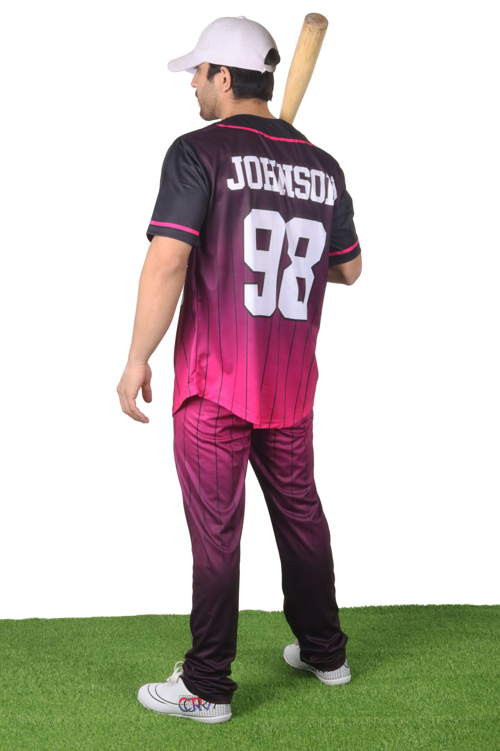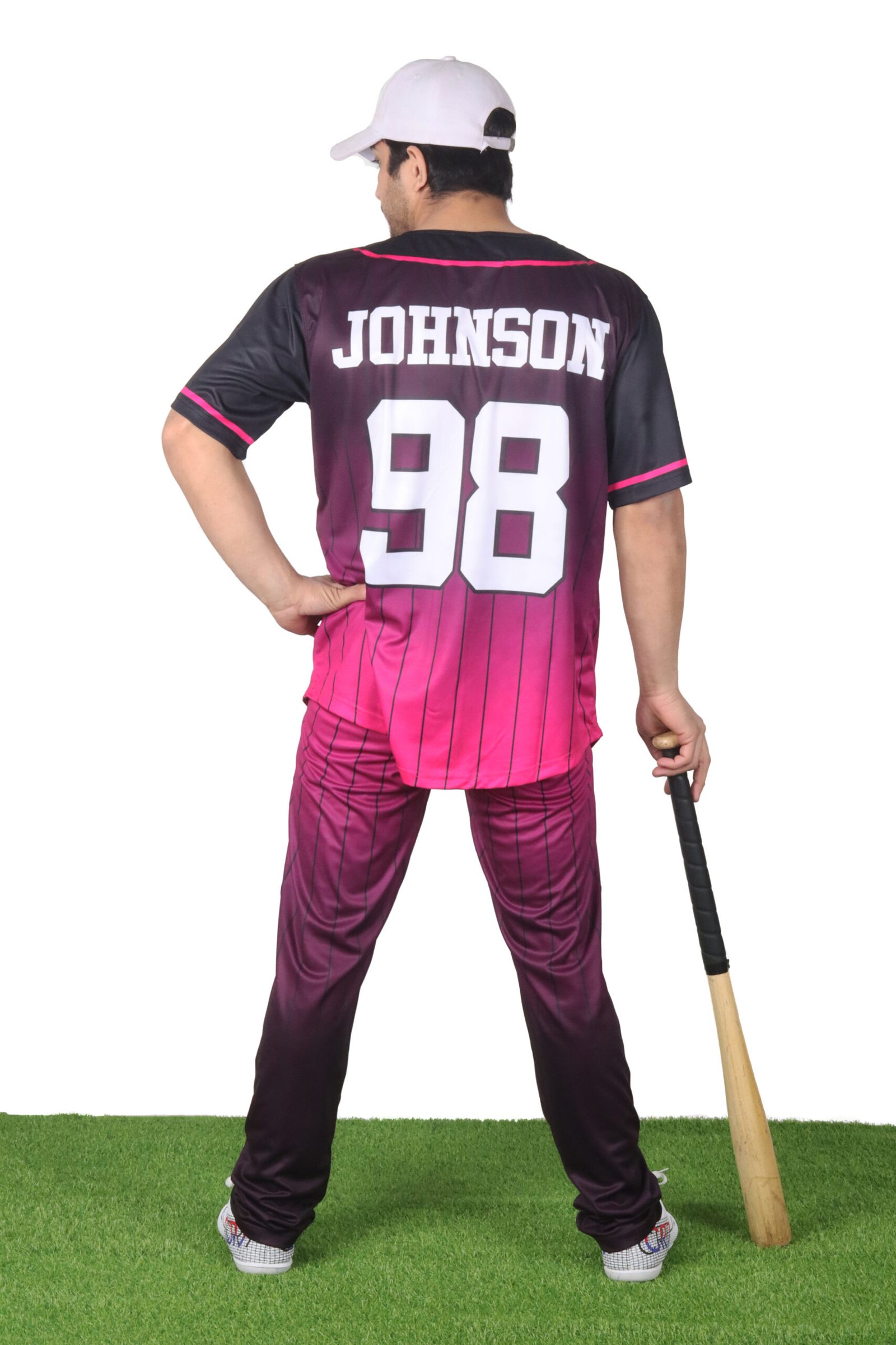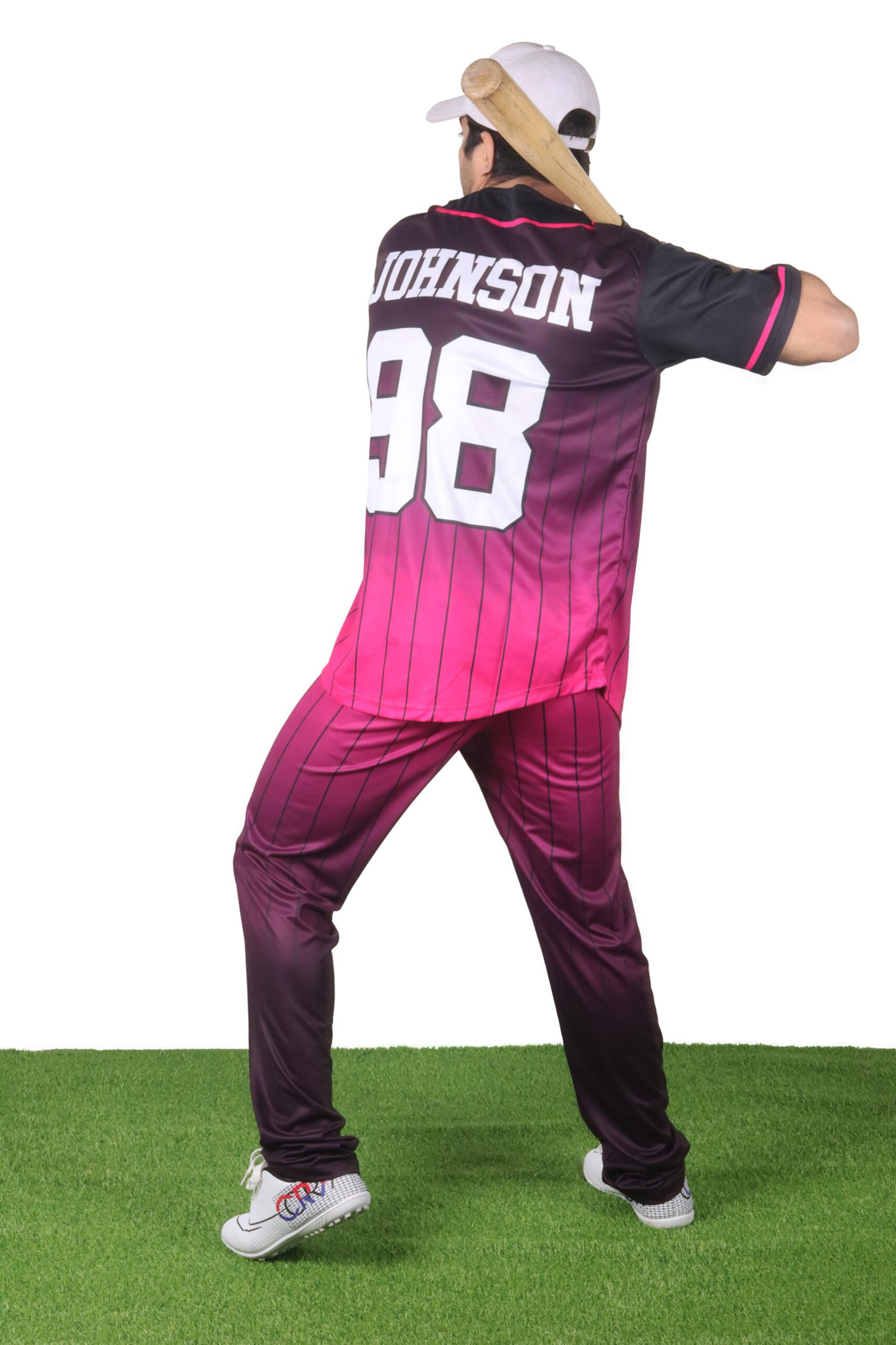 Fade-transition color blend (deep maroon to vibrant pink) with vertical pinstripes for a contemporary, high-visibility team look.